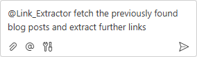 Gistsagent is done, use theLink_Extractoragent by selecting it in the chat prompt via@syntax and add the prompt to execute, for example@Link_Extractor fetch the previously found blog posts and extract further links.