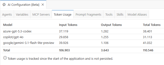 Theia does not yet support context window monitoring like Visual Studio Code, so we cannot inspect detailed context usage. This feature has been requested via Context window inspection / analysis command. For several LLMs, token usage can still be inspected via AI Configuration by switching to the Token Usage tab. I tested the example using GPT-5.3-Codex hosted on Azure, GPT-4o via Copilot, and Gemini 3.1 Flash Lite Preview via Google AI Studio in the Free Tier.