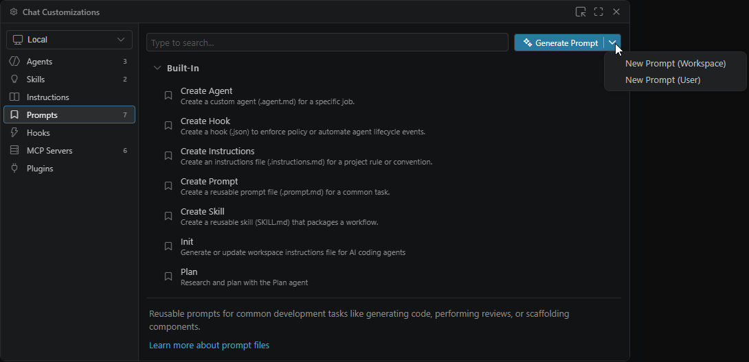 Prompt Files are used to define reusable prompts to execute reusable development tasks and can be installed in the user profile or in the .github/prompts folder.