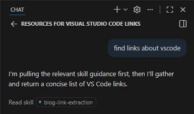 find links about vscode, which let Copilot discover and load the instructions by matching the user prompt with thenameand thedescriptionof the skill - use the slash command to call it directly, e.g.