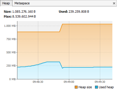 From the above measurements and observations I can say that in most cases there is a performance improvement when using Eclipse Collections compared to the standard Java Collections. And even for use cases where no big improvement can be seen, there is a small improvement or at least no performance decrease. So I decided to integrate Eclipse Collections in NatTable and use the Primitive Collections in every place where primitive values where stored in Java Collections. Additionally I fixed all places where wrapper objects were created unnecessarily. Then I executed the example from the beginning again to measure the memory consumption. And I was really impressed!