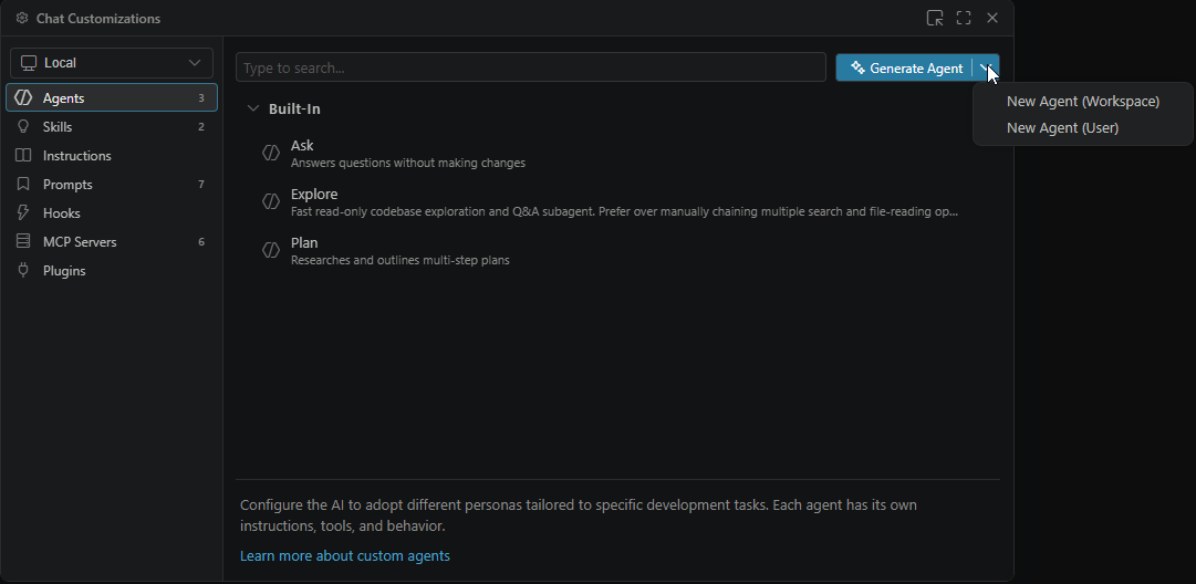 Custom Agents are used to create a specialist assistant for specific tasks that can be used in the chat for planning or research or to define specialized workflows. They can be installed in the user profile or in the workspace in the .github/agents folder - Agent Skills
