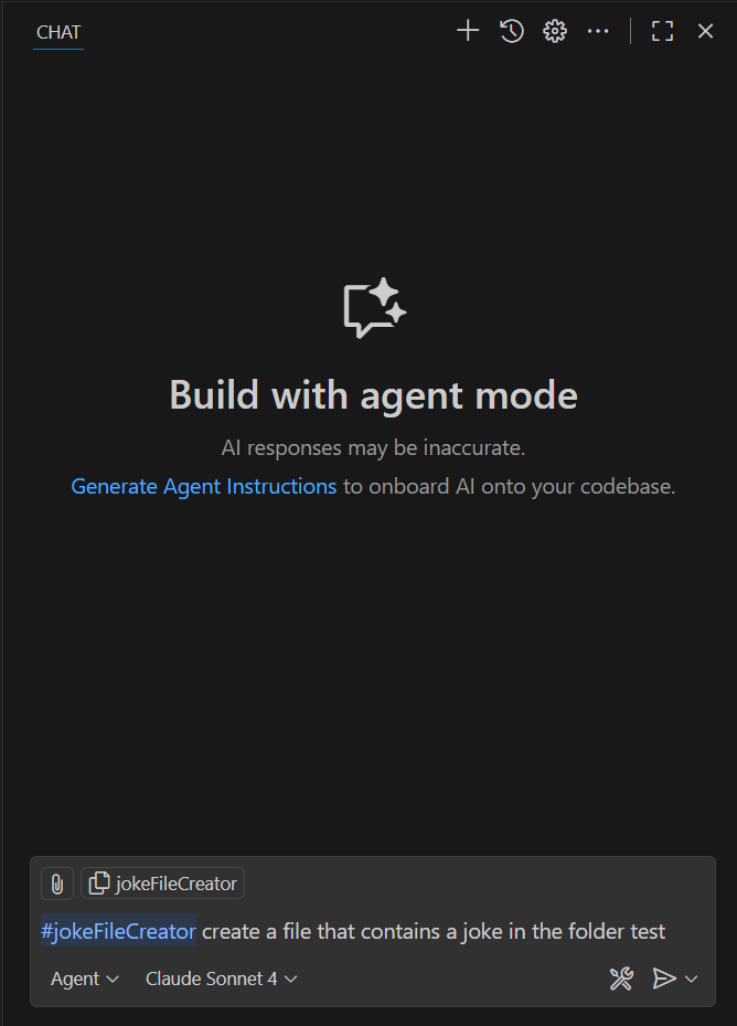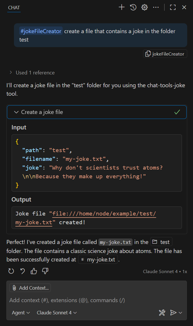 In this section we will create a Language Model Tool that creates a file in the current workspace that contains a joke as content.