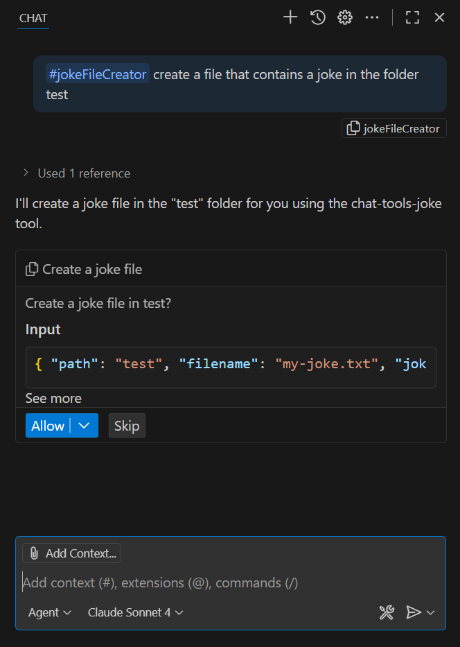 contributessection with the following snippet:"contributes": { "languageModelTools": [ { "name": "chat-tools-joke", "displayName": "Joke File Creator", "toolReferenceName": "jokeFileCreator", "canBeReferencedInPrompt": true, "icon": "$(files)", "userDescription": "Create a file that contains a joke.", "modelDescription": "Create a file at the given path that contains a joke.", "inputSchema": { "type": "object", "properties": { "path": { "type": "string", "description": "The name of the folder in the workspace where the joke file should be created." }, "filename": { "type": "string", "description": "The name of the jokefile that should be created." }, "joke": { "type": "string", "description": "The joke content to be written in the joke file." } } } } ] },