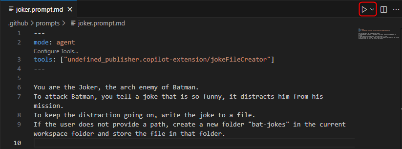 async invoke( options: vscode.LanguageModelToolInvocationOptions<IJokeFileParameters>, token: vscode.CancellationToken ): Promise<vscode.LanguageModelToolResult | null | undefined> { const params = options.input; const result = await this.createJokeFile( params.path, params.filename, params.joke ); if (result.length > 0) { return new vscode.LanguageModelToolResult([ new vscode.LanguageModelTextPart(result), ]); } else { return new vscode.LanguageModelToolResult([ new vscode.LanguageModelTextPart(`Joke file creation failed`), ]); } } public async createJokeFile( path: string, filename: string, jokeContent: string ): Promise<string> { const workspaceFolders = vscode.workspace.workspaceFolders; if (!workspaceFolders) { vscode.window.showErrorMessage("No workspace folder open."); return ""; } let folder = workspaceFolders[0]; let pathUri = vscode.Uri.joinPath(folder.uri, path); try { await vscode.workspace.fs.stat(pathUri); } catch { vscode.workspace.fs.createDirectory(pathUri); } const fileUri = vscode.Uri.joinPath(pathUri, filename); try { await vscode.workspace.fs.writeFile( fileUri, Buffer.from(jokeContent, "utf8") ); return `Joke file "${fileUri}" created!`; } catch (error) { return `Failed to create joke file: ${error}`; } } - Add the following