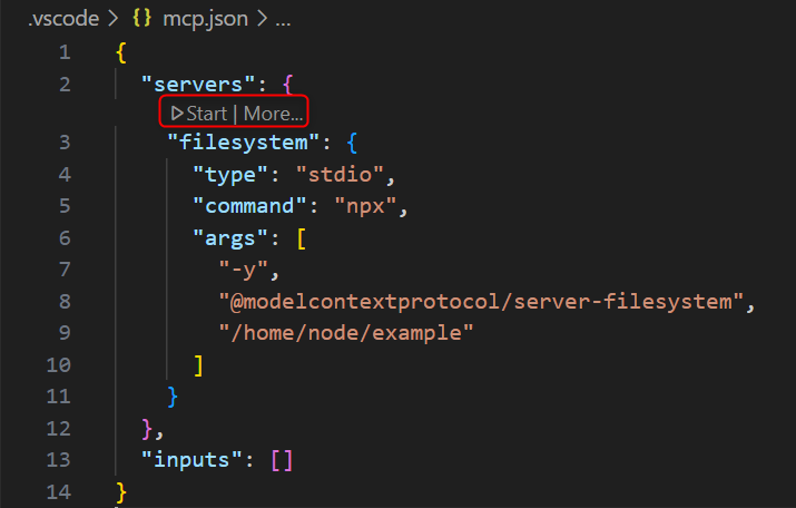 { "servers": { "filesystem": { "type": "stdio", "command": "npx", "args": ["-y", "@modelcontextprotocol/server-filesystem"] } }, "inputs": [] }