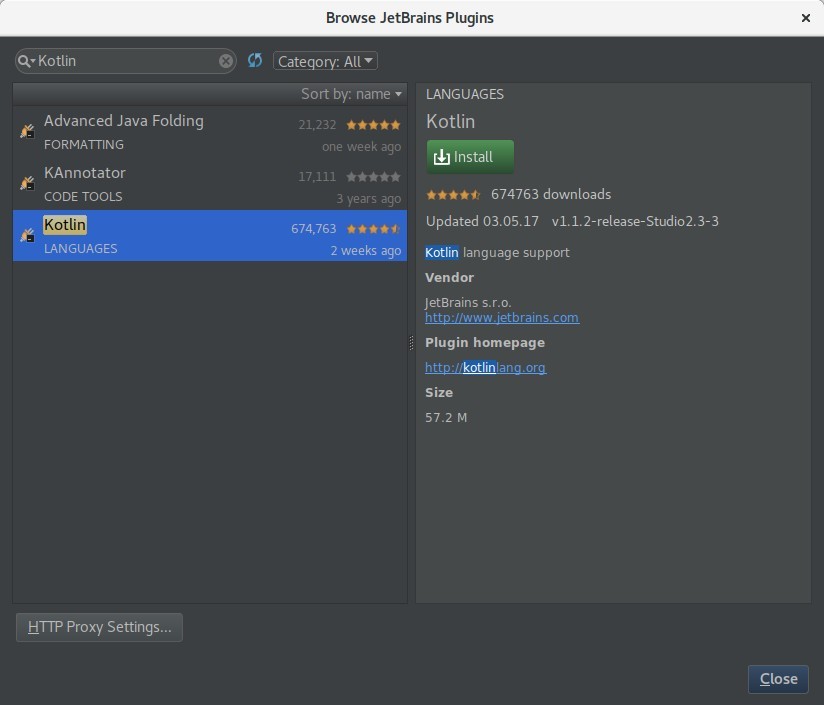 In the opened dialog, search for Kotlin, select the corresponding plugin and press Install.