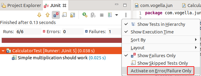 To see the result of a JUnit test, Eclipse uses the JUnit view which shows the results of the tests. You can also select individual unit tests in this view, right-click on them and select Run to execute them again.