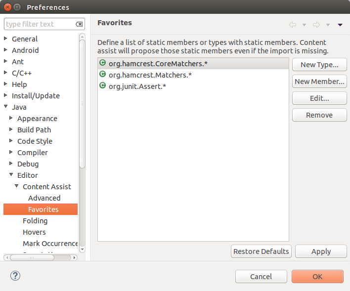 This makes, for example, the assertTrue, assertFalse and assertEquals methods directly available in the Content Assists.
