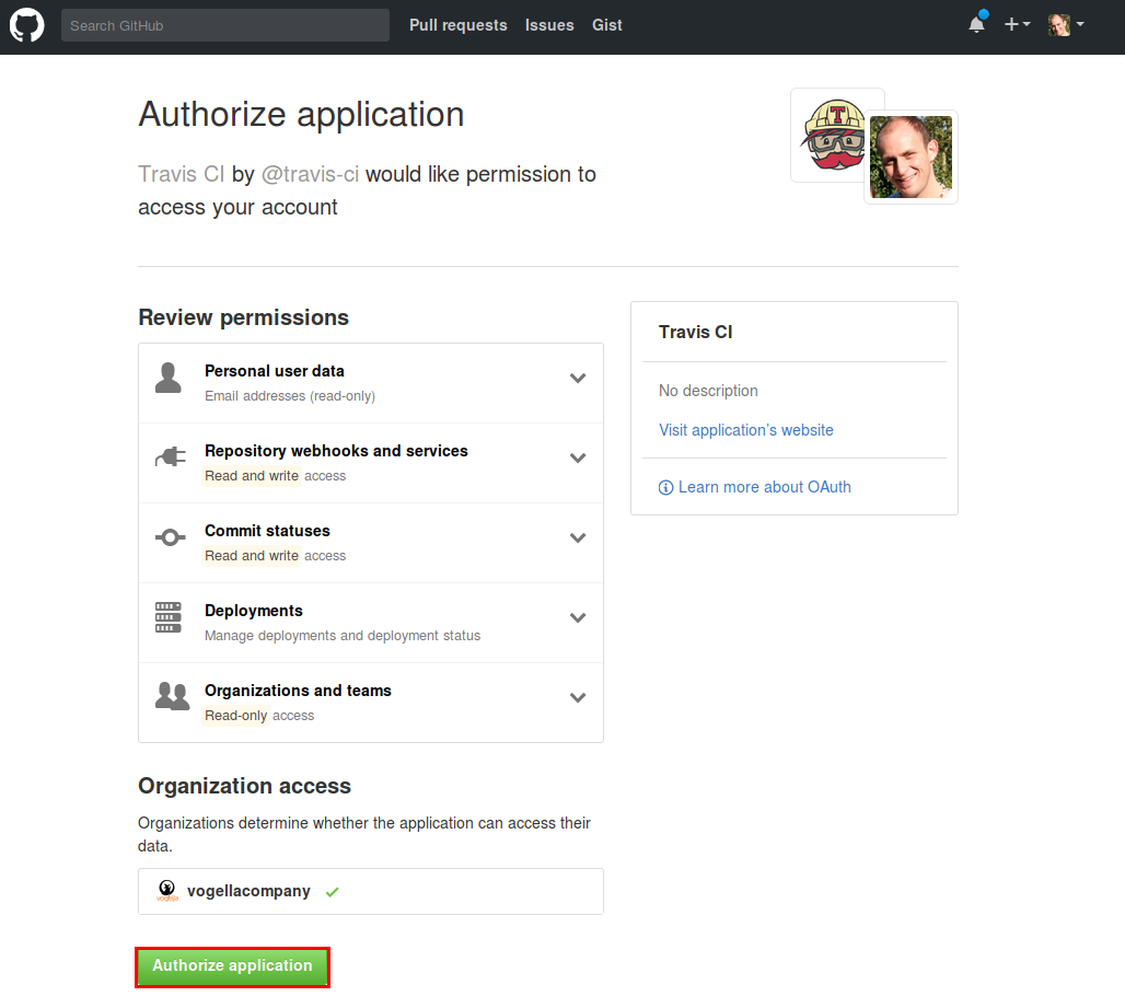 Press Authorize application to authorize Travis CI, confirm this with your password and Travis CI will check which repositories are available.